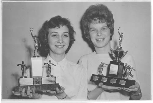 ![]() Diane Braden and Lynda Bazett relishing their bowling trophies from 1959 |